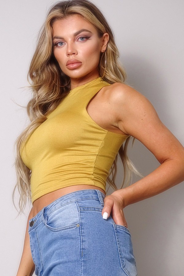 High neck racerback crop tank top. Sleeveless. Mock neckline. Racerback detail